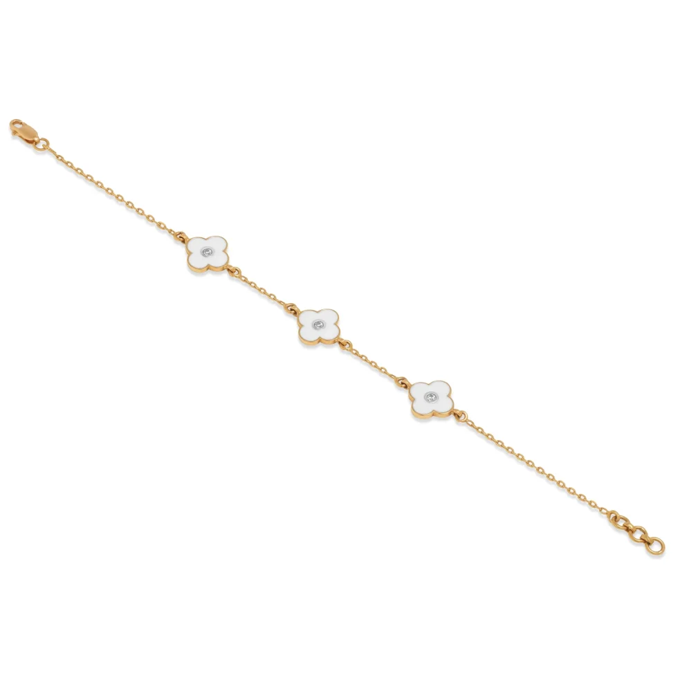 This delicate gold bracelet features graceful floral motifs finished in a soft ivory tone, each centered with a subtle accent that adds quiet charm. Linked along a fine gold chain, the design feels light, refined, and effortlessly feminine.